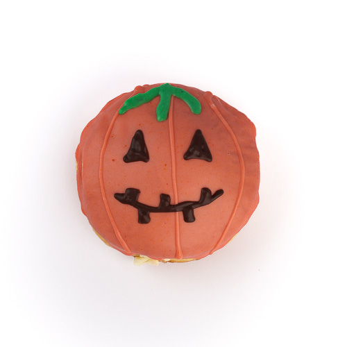 HALLOWEEN limited edition krofna bundeva, prelivena belom čokoladom u boji, punjena belim kinder kremom.