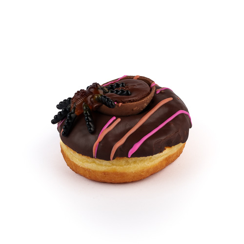HALLOWEEN limited edition krofna prelivena mlečnom čokoladom sa čoko jajetom napunjeno nugat kremom i gumenom bombonom u obliku pauka u raznim bojama (crveni, zeleni, žuti).