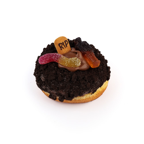 HALLOWEEN limited edition krofna prelivena mlečnom čokoladom, posuta oreo keksom i punjenja nugat kremom sa mini plazom, gumenom bombonom u raznim oblicima bojama (kosturska glava, skelet, šišmiš i sl.).