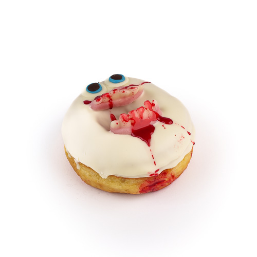 HALLOWEEN limited edition krofna prelivena belom mlečnom čokoladom, ukrašena šećernim bombonama u obliku zuba, jestiva boja